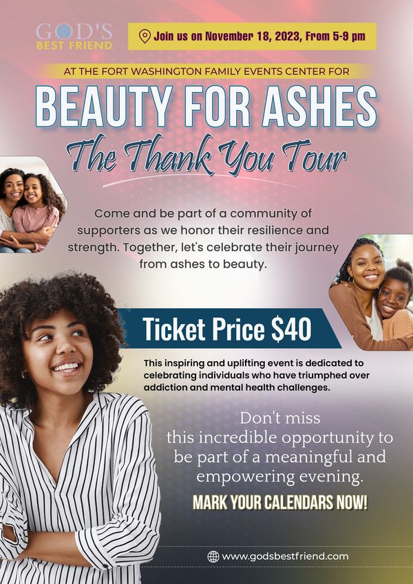 Join us on November 18, 2023, from 5-9 pm at the Fort Washington Family Events Center for an inspiring and uplifting event called "Beauty for Ashes, The Thank You Tour." This event is dedicated to celebrating individuals who have triumphed over addiction and mental health challenges. Come together with a community of supporters to honor their resilience and strength. Don't miss this incredible opportunity to be part of a meaningful and empowering evening.